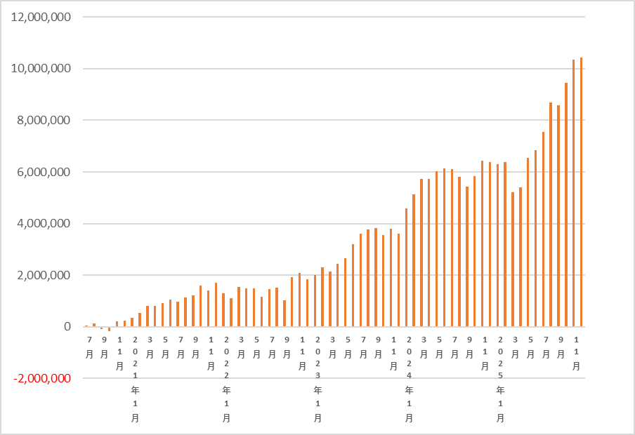 2025年の伸びが際立っています。含み益だけで1000万円を超えたことが何より嬉しいです。唯一の心残りは、ポートフォリオ全体でダブルバガーを達成できなかったことです。来年早々に達成したいです。
